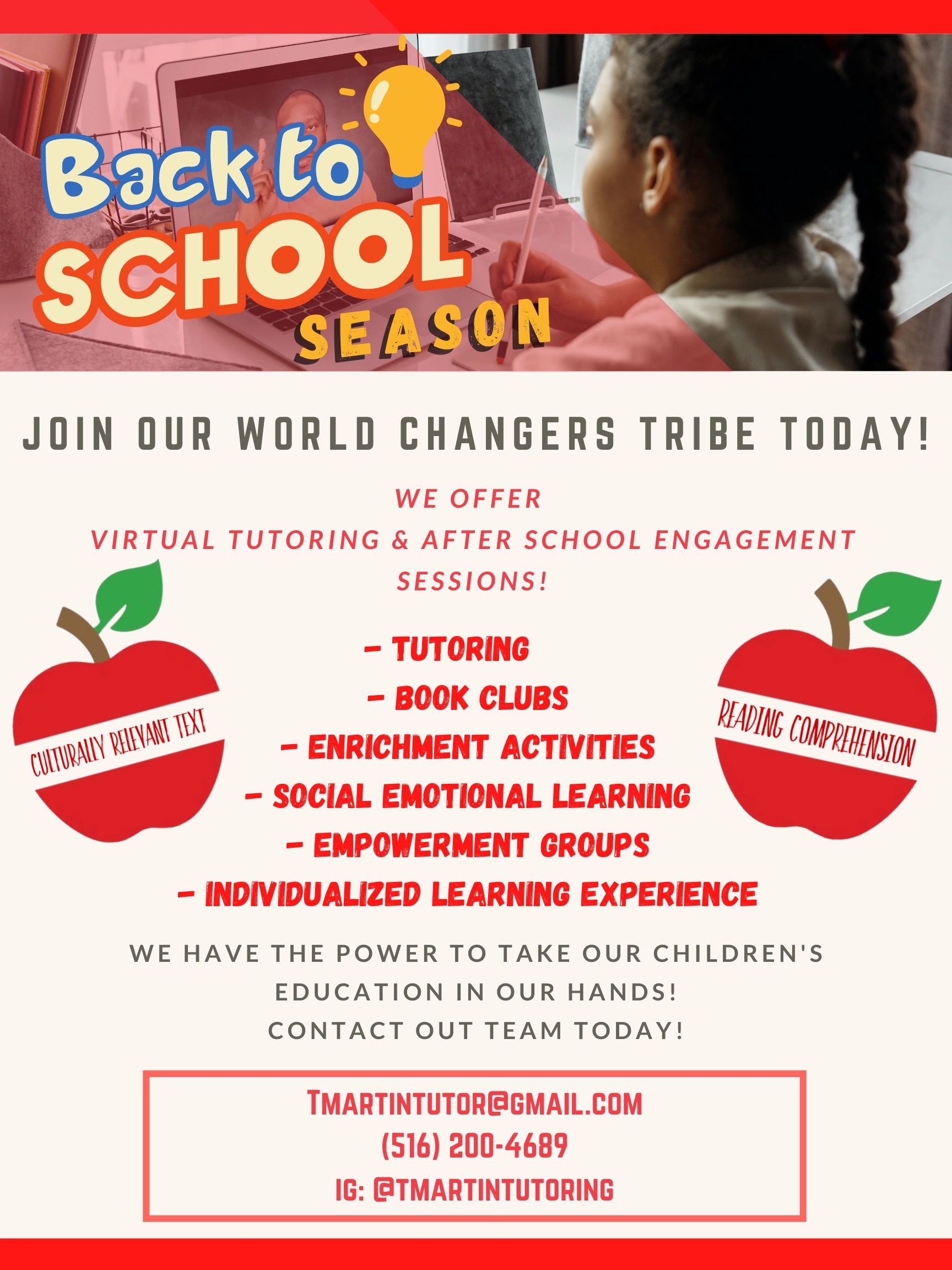 Each World Changer is set up with an individualized success plan to meet their individualistic educational needs. We work collaboratively with not only our families yet their respective schools to target our Tutoring Sessions. It is imperative that all stakeholders in the World Changers life work together for optimal Success.